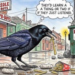 "Order!" boomed a familiar baritone voice, cutting through the ethereal haze. It was L'Esprit Souverain des Marais (The Sovereign Spirit of the Swamps), one of the many New Orleans resident endangered species historians. His Black Rail voice is surprisingly deep for such a diminutive rough Bald Cypress tree knobby knee gnome figure now making his way forward.
